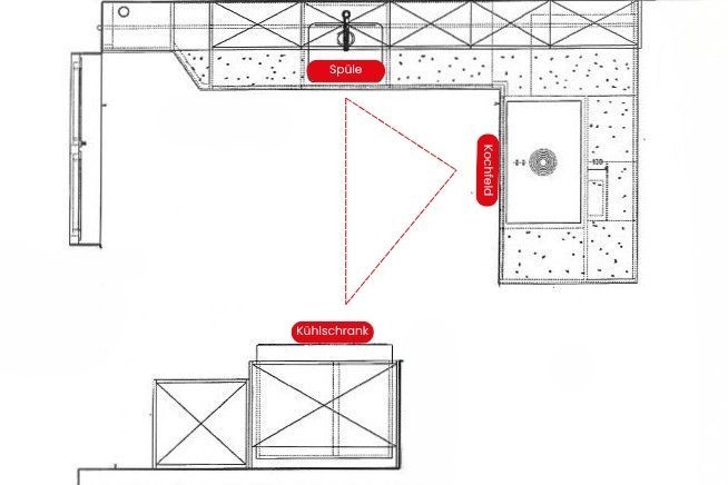 Das Arbeitsdreieck verbindet die drei wichtigsten Zonen in der Küche: Kochfeld, Spüle und Kühlschrank. Diese drei Bereiche bilden die Eckpunkte eines imaginären Dreiecks und sorgen dafür, dass Abläufe in der Küche reibungslos funktionieren. Arbeiten in der Küche werden dadurch effizienter, stressfreier und sicherer. So wird zum Beispiel das Tragen des schweren Topfs mit kochendem Wasser durch den kurzen Weg zur Spüle sicher. Die durchdachte Anordnung trägt dazu bei, dass alles leicht zu erreichen ist und trotzdem genügend Bewegungsfreiheit besteht, auch wenn mehrere Personen in der Küche arbeiten.
