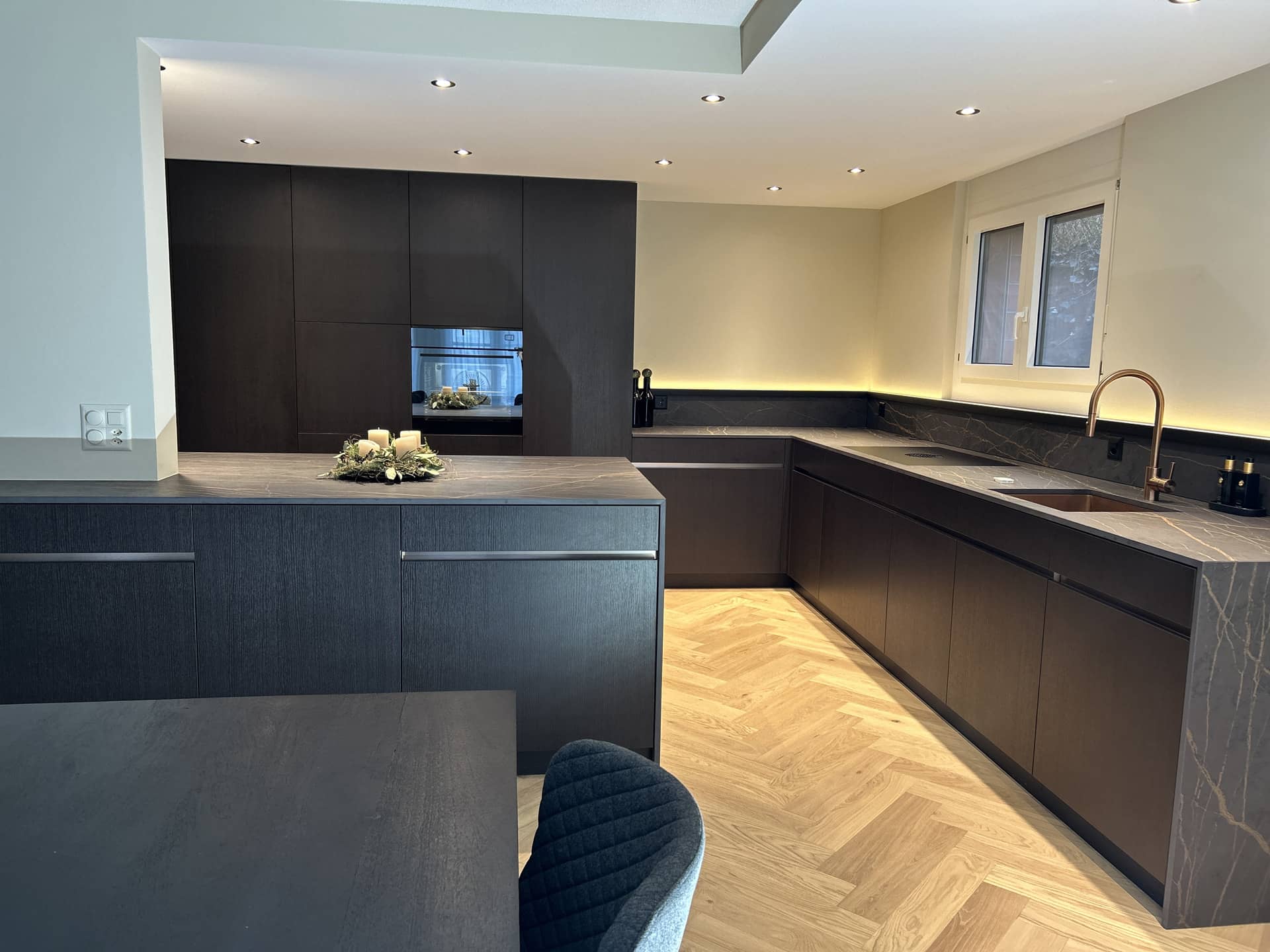 Zuerst werden Sockel und Unterschränke montiert, gefolgt von den Oberbauten. Anschliessend wird die Arbeitsplatte verlegt, wobei die Ausschnitte für Kochfeld und Spülbecken bereits im Werk vorbereitet sind. Danach finden Geräte ihren Platz, und alle Sanitär- und Elektroanschlüsse werden fertiggestellt. Zum Abschluss folgen Feinarbeiten wie das Montieren von Türen, Schubladen und Griffen. Nach der Fertigmontage wird die passende Nischenrückwand ausgewählt – der letzte Schliff für ein harmonisches Gesamtbild. In der Regel ist die neue Küche nach rund 1–2 Wochen vollständig umgesetzt.